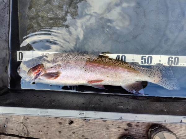 右ワンド奥のシャロ―エリアにてトルネードでヒットした62cmのレインボー♪