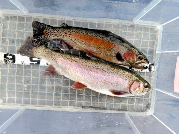 右ワンド奥のシャロ―エリアにてスプーンでヒットした56cmとトルネードでヒットした49cmのレインボー!
