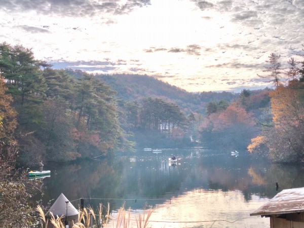 おはようございます。11月24日(月)の通天湖です。早朝は霜が降り、気温も低めで曇りがちな天気となっています。