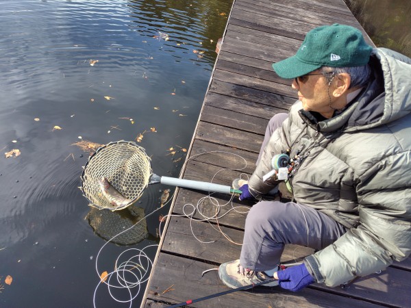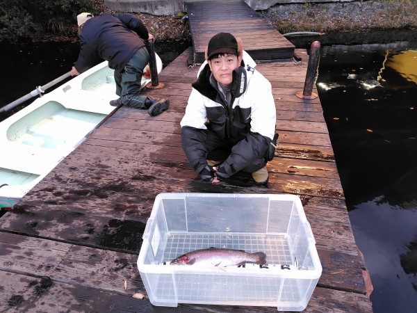 右ワンド奥のシャロ―エリアにてトルネードでヒットした48cmのレインボー♪