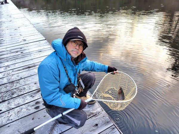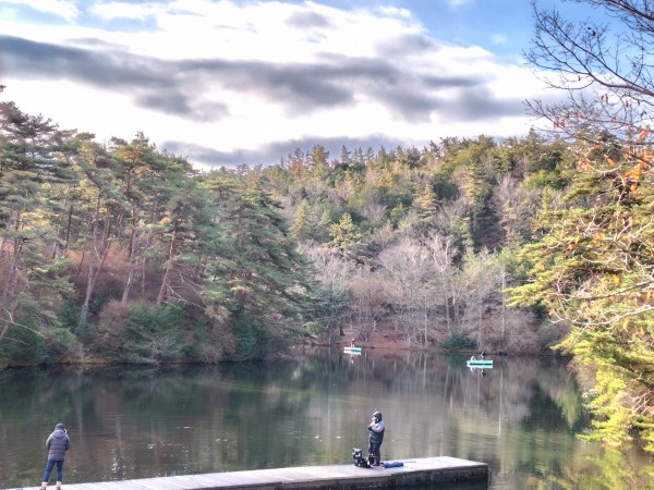 おはようございます。12月10日(水)の通天湖です。今朝7時の気温は0度と冷え、桟橋やボートには霜が降り凍結してますが、湖面の凍結はありません。