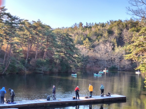 おはようございます。12月13日(土)の通天湖です。今朝7時の気温は1度と冷え、桟橋やボートには霜が降り凍結してますが、湖面の凍結はありません。