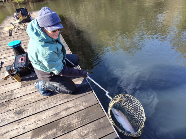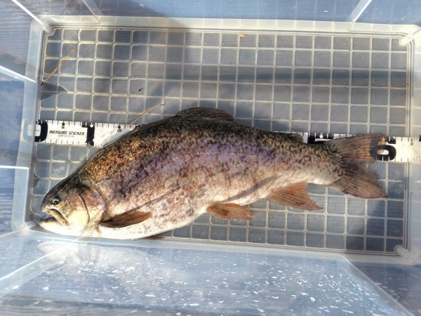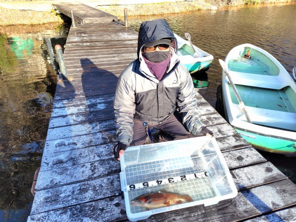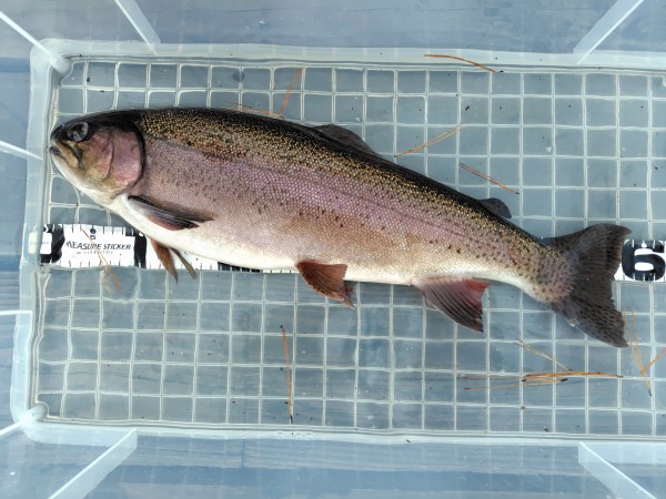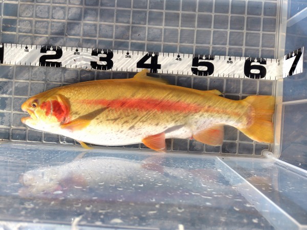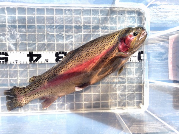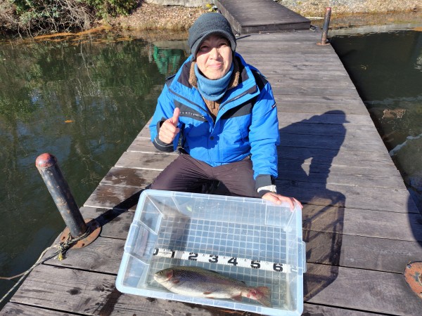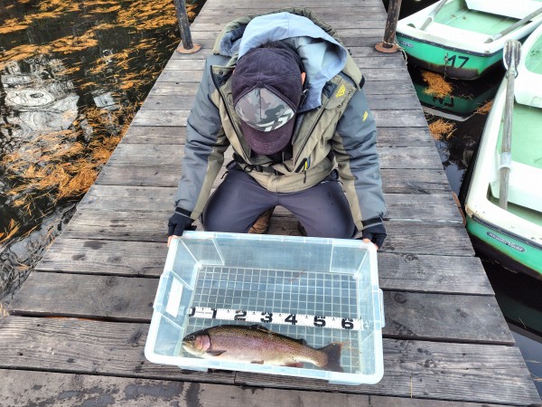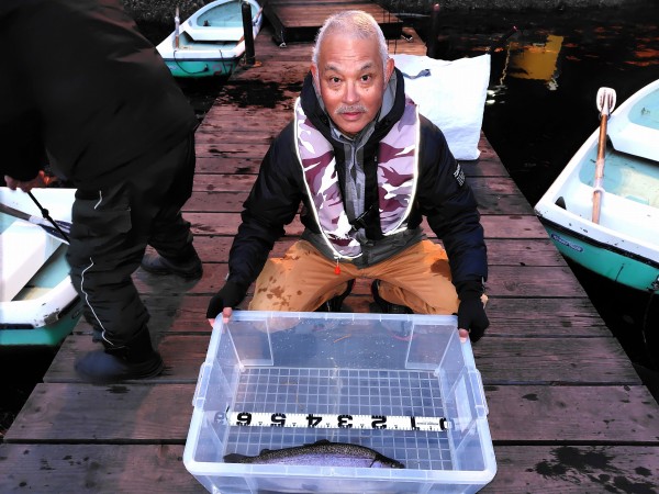 右ワンド川筋にてフェザージグでヒットした49cmのニジマスのアルビノ♪