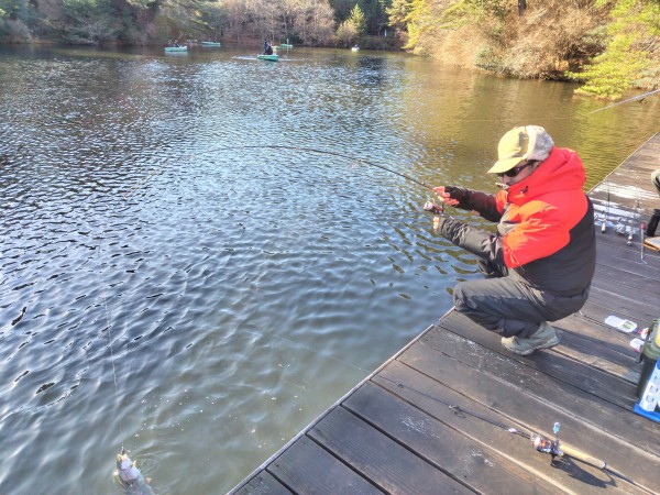 桟橋からマイクロスプーンのボトムバンプでヒットした46cmのレインボー♪