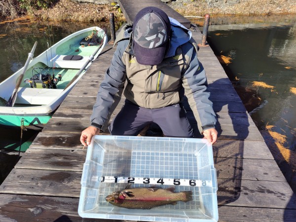 右ワンド奥のシャロ―エリアにてトルネードでヒットした55cmのレインボー!