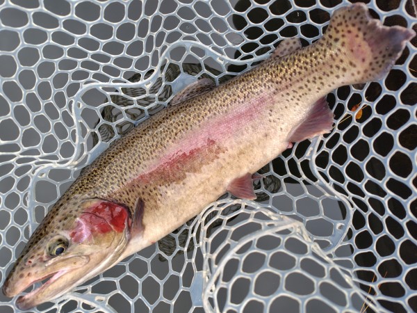 午前中はコンスタントに雨が降り、その後も降ったり止んだりの寒い日となりましたが、水温が安定していたせいか、トラウトの活性はいい感じでした。