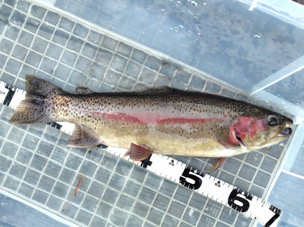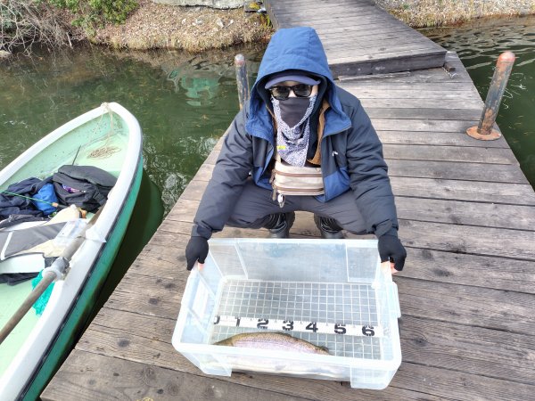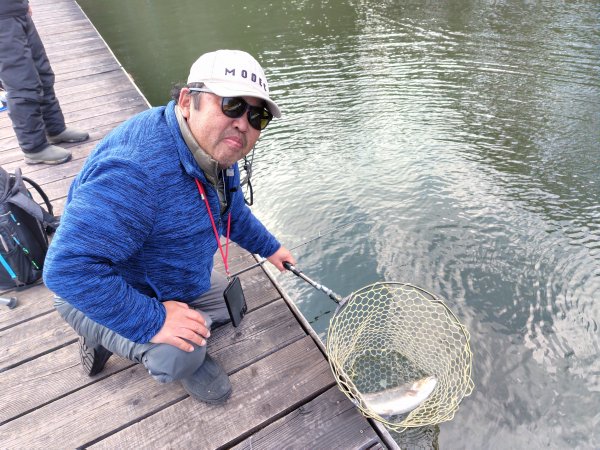 右ワンド奥のシャロ―エリアにてフェザージグでヒットした54cmのレインボー!