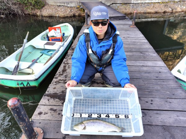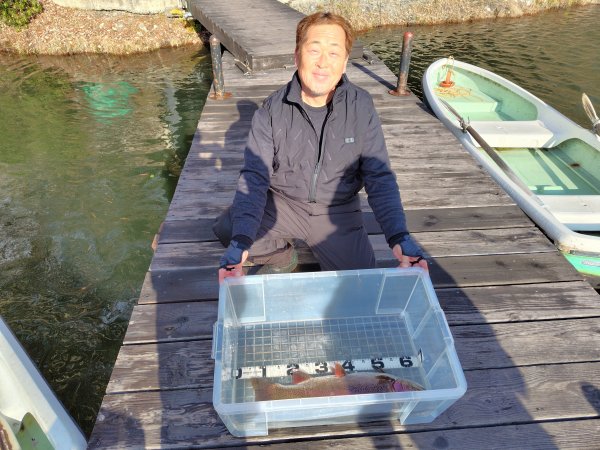 | 右ワンド奥のシャロ―エリアにてフェザージグでヒットした57cmのニジマスのアルビノ! | |||